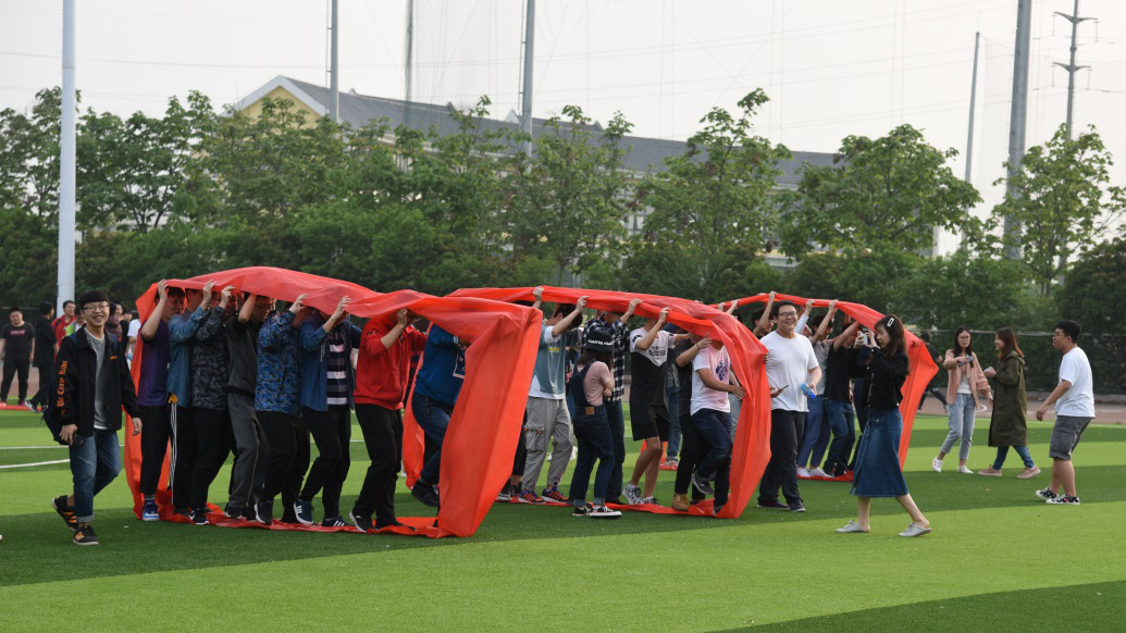 各班级按年级和专业分为3组,每班派出8名参赛队员,自行设计剪裁滚筒布并通过首尾粘连的方式形成履带式风火轮,队员依次队列推动前进。其目的旨在提高团支部同学创新意识,培养合作精神,使同学们成为富有同理心、包容心和进取心的青年人。