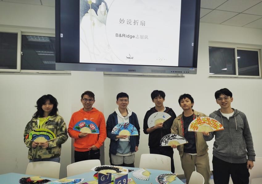 随后,到了本次活动最有趣味性的环节——制作手绘纸扇。志愿者服务队队员协助同学们进行纸扇的艺术制作。大家完成自己的纸扇作品后,互相分享制作经验及成果。最后,B&Ridge志愿者服务队队长伍方洲同学对活动作了总结。