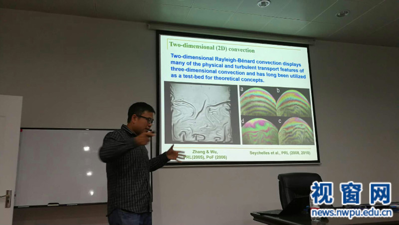 上海大学周全研究员做了题为“Heat Transport in Turbulent Thermal Convection”的报告,介绍了Rayleigh-Bénard对流中几个关键物理参数(Nusselt数,Rayleigh数,Prandtl数,宽高比等)对流动和传热的影响,展示了一些有趣的实验和数值结果。周全研究员多年来一直从事流体力学方面的科学研究,已在相关研究领域共发表SCI论文30余篇。目前的研究兴趣有:实验流体力学、Rayleigh-Bénard热对流和Rayleigh-Taylor湍流。
