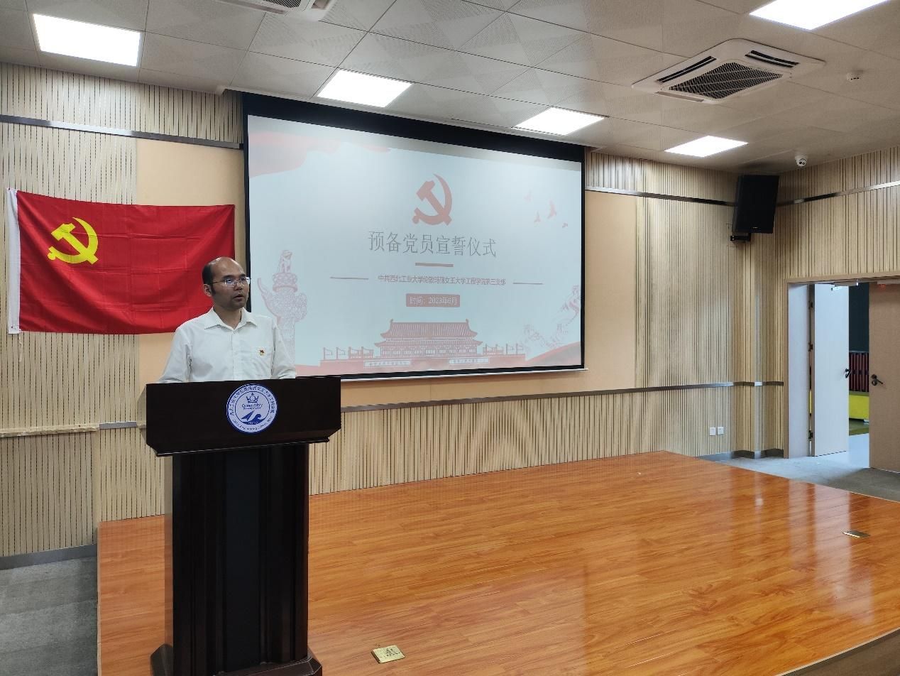 伴随着激昂庄严的《国际歌》,宣誓仪式正式拉开帷幕。首先,党支部书记黄拳章对新加入党组织的成员表示祝贺,接着支部党员王睿璇老师宣读了宣誓人名单,随后在支部书记黄拳章的带领下,34名预备党员面向党旗庄严宣誓,许下为共产主义奋斗终身的誓言。