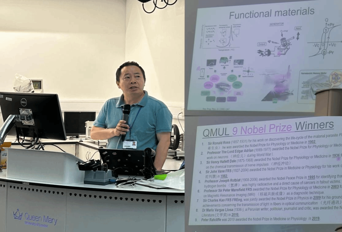 Haixue Yan老师向同学们介绍了伦敦玛丽女王大学9位诺贝尔奖获得者的主要事迹,并为同学们介绍了材料科学与工程专业以及IOM3的相关情况及功能材料的多种分支,丰富了同学们对材料学科的认识