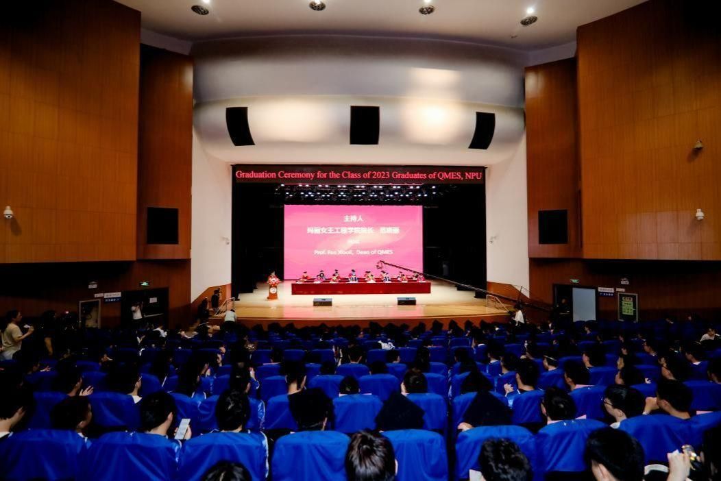 On the afternoon of June 25, the graduation ceremony and British degree awarding ceremony of QMES was held in the Ao'xiang Student Center, Chang'an Campus. Song Baowei, President of NPU; Colin Bailey, President of QMUL; Zhang Yanning, Vice President of NPU; Academician Wen Wang, Vice President of QMUL; Li Jinshan, Dean of School of Materials Science and Member of JAC; Gabriel Cavalli, Executive Vice Dean of QMES; Andy Bushby, a JAC member; Wang Haipeng, Director of Academic Affairs Office and Member of JAC; Zhang Fuli, Director of International Cooperation Office and Member of JAC; Han Suomin, Director of Finance Department and Member of JAC; Zhang Yingqun, Director of Education Foundation Office; Sonal Hathi, Director of QMUL Alumni Association; Jing Liu, MEMA China Manager of QMUL; Faith Nightingale, Director of Teaching Affairs of QMES; Fan Xiaoli, Dean of QMES; Dai Fuping, Secretary of the Party Committee and Vice Dean of QMES; Cheng Yin, Vice Dean of QMES; the faculty and staff of QMES; and all graduates of the class of 2023 and representatives of their relatives and friends attended the graduation ceremony which was presided over by Dean Fan Xiaoli.