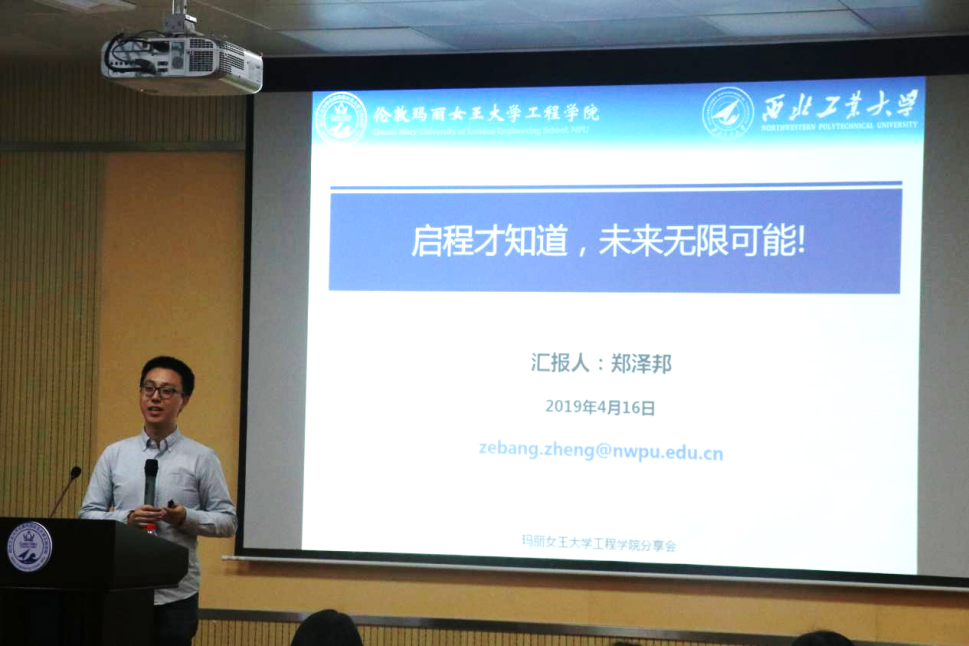 On 16thApril, 2019, Prof. Zheng Zebang, NPU Ao Xiang Overseas Talent, was invited to give a lecture to the undergraduates in QMES on the experiences of oversea study entitled “Start for Unlimited Future”. Prof. Chen Jun, Vice Dean of QMES was at present. Students from the School of Power and Energy and QMES, as well as representatives of students’ parents attended.