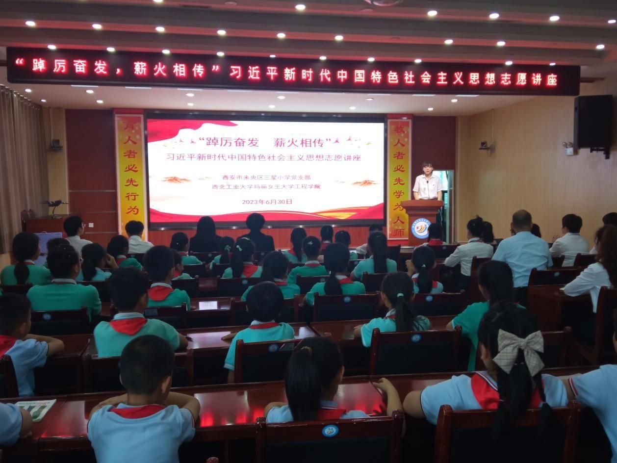 On the morning of June 30, 2023, Huang Quanzhang, the secretary of the Third-Party Branch with integration of teachers and students of QMES; Song Jiayin, the Branch staff Party member; Xia Chenhe and Tao Mujia, probationary student party members; Zhu Meng, a prospective student Party member; and the student Gansu from Youth Propaganda Team of NPU, went to Sanxing Primary School in Weiyang District, Xi’an to give lectures and patriotic education activities. Liu Chunli, the secretary of the party branch of Sanxing Primary School, and all the party and league members, and more than 40 representatives of young pioneers, participated in this activity, which was hosted by Song Jiayin.