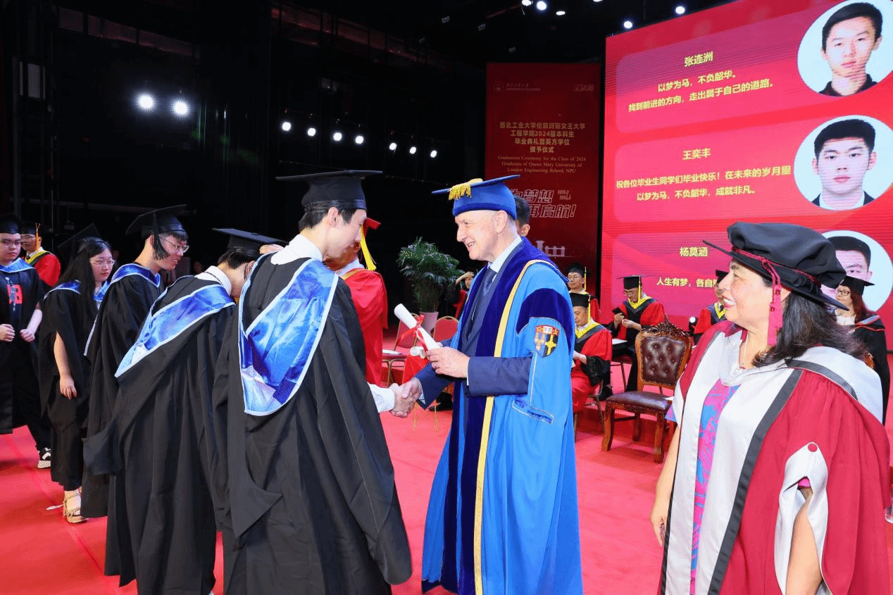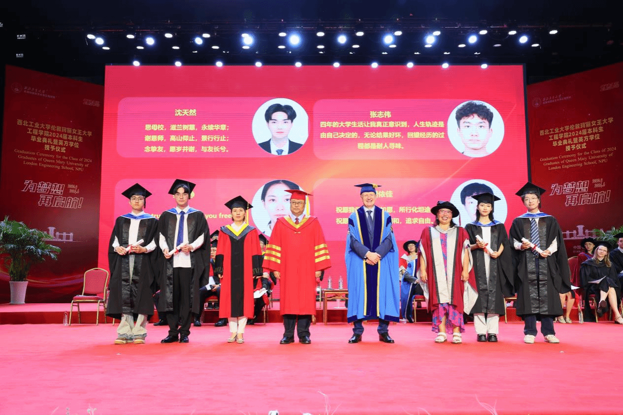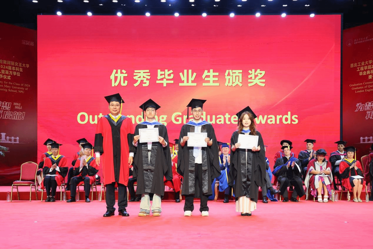 Thanks to the joint efforts of the two institutions, the Class of 2024 graduates have excelled. Wang Wen awarded the QMUL Principal’s Awards to Chen Shaoqian, Yin Yuehao, Ye Yuanming, and Jiang Zixian. Kong Jie, Director of the International Cooperation Office at NPU, presented the Best Paper Awards to Sun Yuyao and Li Fengyuan, and the Best Progress Award to Zhang Zhiwei. Additionally, Wang Haipeng, Director of the Undergraduate Academic Affairs Department, and She Leilei, Secretary of the NPU Youth League Committee, awarded the Outstanding Graduate Certificates to 33 students, including Xue Longqi, Yang Zihan, and Li Hao, congratulating them on their exceptional academic achievements.