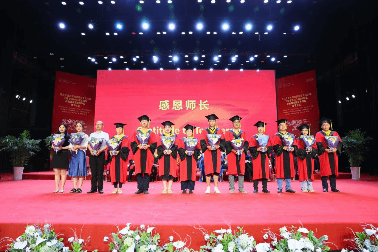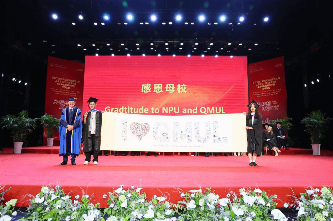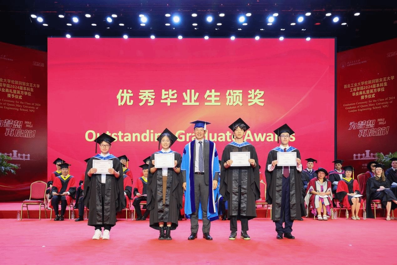Thanks to the joint efforts of the two institutions, the Class of 2024 graduates have excelled. Wang Wen awarded the QMUL Principal’s Awards to Chen Shaoqian, Yin Yuehao, Ye Yuanming, and Jiang Zixian. Kong Jie, Director of the International Cooperation Office at NPU, presented the Best Paper Awards to Sun Yuyao and Li Fengyuan, and the Best Progress Award to Zhang Zhiwei. Additionally, Wang Haipeng, Director of the Undergraduate Academic Affairs Department, and She Leilei, Secretary of the NPU Youth League Committee, awarded the Outstanding Graduate Certificates to 33 students, including Xue Longqi, Yang Zihan, and Li Hao, congratulating them on their exceptional academic achievements.