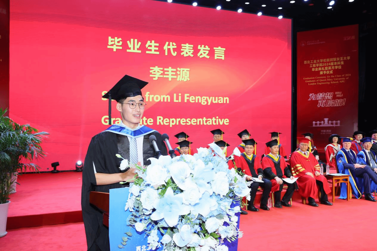 On behalf of the NPU Party Committee Secretary Li Yanrong and all the faculty and students, Song Baowei extended his heartfelt congratulations and best wishes to the graduates for completing their undergraduate studies. He also expressed gratitude to the teachers and parents from both NPU and QMUL who have long supported the development of QMES and the growth of its students. He noted that over the past four years, students have witnessed the collaborative progress between the two universities while continually pushing their boundaries and striving for excellence, achieving outstanding results in various activities. As parting advice, he offered three key hopes for the graduates: first, to aim high and have a global perspective, navigating the currents of the times with determination; second, to diligently study and innovate, striving for excellence through grounded effort; and third, to broaden their horizons and embrace the future with confidence on the global stage. Song Baowei warmly added, “Wherever you go, your alma mater will always be your most steadfast support and warmest haven. We hope you will continue to care for and support the development of your alma mater, and we look forward to welcoming you back whenever the opportunity arises.”