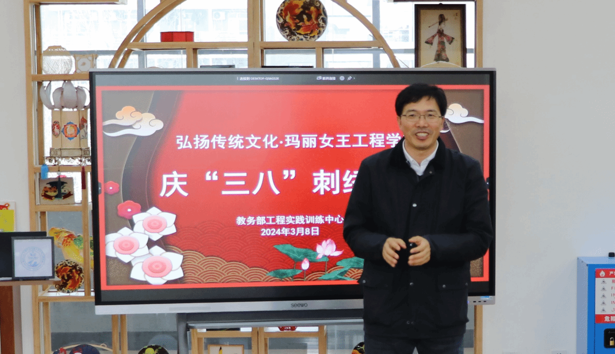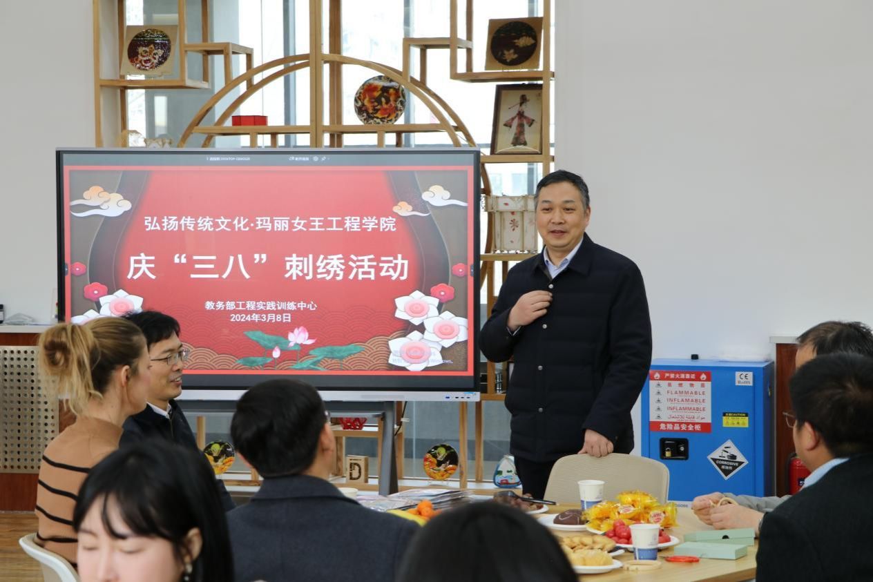 春风轻拂,指尖流转,万千彩线在巧手中翩翩起舞,绣出了一幅幅绚烂多彩的图案,这是属于中国女性的浪漫与智慧——刺绣。为庆祝第114个“三八”国际妇女节,3月8日下午,伟德国际VICTOR1946在长安校区工程实践训练中心创新社区国际化创新实践基地C201精心策划了一场主题为“线线情缘,魅力刺绣”的活动,以展现新时代女性的风采与魅力。教务部部长王海鹏、教务部(工程实践训练中心)主任蒋建军、公司党委书记兼副经理代富平、副经理王永欣、院工会主席武阿璟、英方老师及公司教职工参加此次活动。